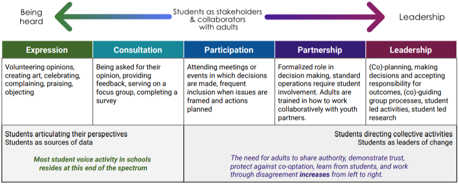 As you move across the figure from left to right, students’ roles, responsibilities, and decision-making authority grows. On the left side, student voice activity is limited to youth voice through communication or data; on the right, students may be directing collective actions of both peers and adults. Activities in the middle areas blend these orientations. In the graphic below, Toshalis and Nakkula explain that through student-voice-oriented activities, students can move from data sources to leaders of change.